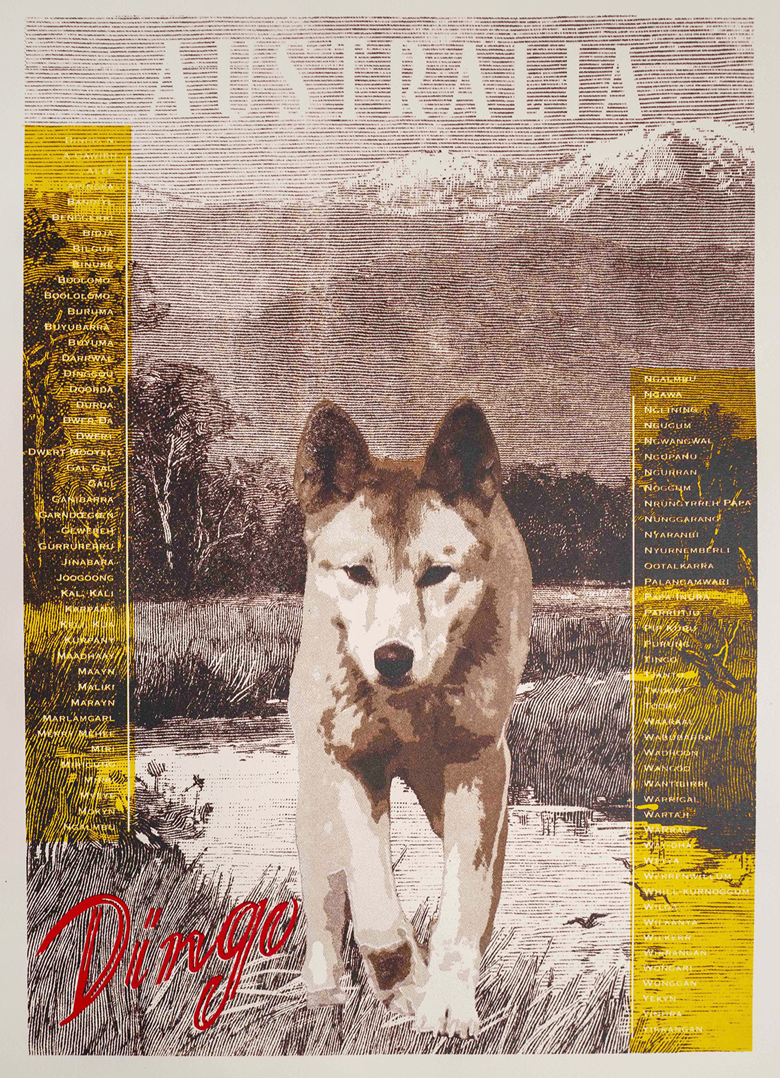 Dingo is a photomontage screen print on Fabriano Rosaspina 285gsm paper. The image lists the names of the dingo in First Nations languages across Australia. Dingoes are classified a pest species across much of Australia, and eradication is often mandatory. They have recently gained protection in the north-west of Victoria where they are listed as vulnerable to extinction. Dingoes are a Cultural Keystone Species, of significant status to First Nations people of Australia, as companions, kin, and as top order predator.