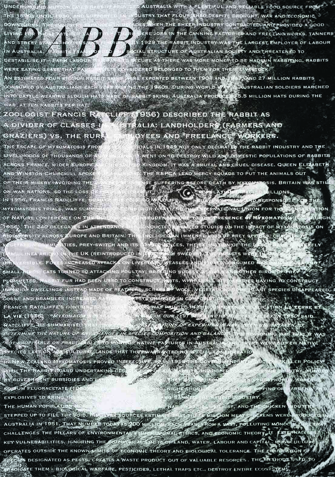 The text in the background of the print tells the longer story, with the rabbit holding an iconic army slouch hat – Australia made 5.5 million of these hats for the soldiers in World War II, at 10 rabbits per hat. Myxomatosis brought an abrupt end to the cheap supply of meat and felt – ushering in the immensely profitable and environmentally damaging CAFO (Concentrated Animal Feeding Operation) chicken farms as a food replacement, and great expansion for the sheep industry.