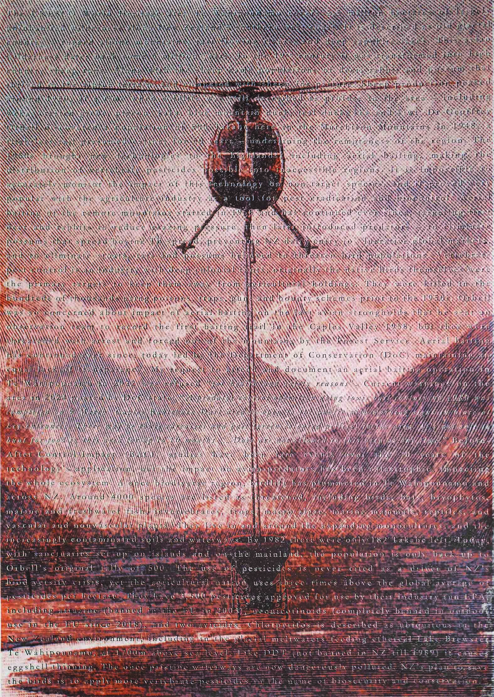 The background detail is from an intaglio etching of Mt Aspiring 1888. The helicopter is attached to a large bucket of cereal baits, dispensing the pesticide – an A1 hazardous substance, over the remote alpine region. New Zealand and Australia are unique in that they are the only country’s in the world that allow aerial baiting of wildlife across their mainlands – initially this was to protect livestock, but more recently aerial baiting has been redeployed as a “conservation” tool. There is so much support for the use of chemical pesticides that it is difficult to publish anything about the dangers of this technology.