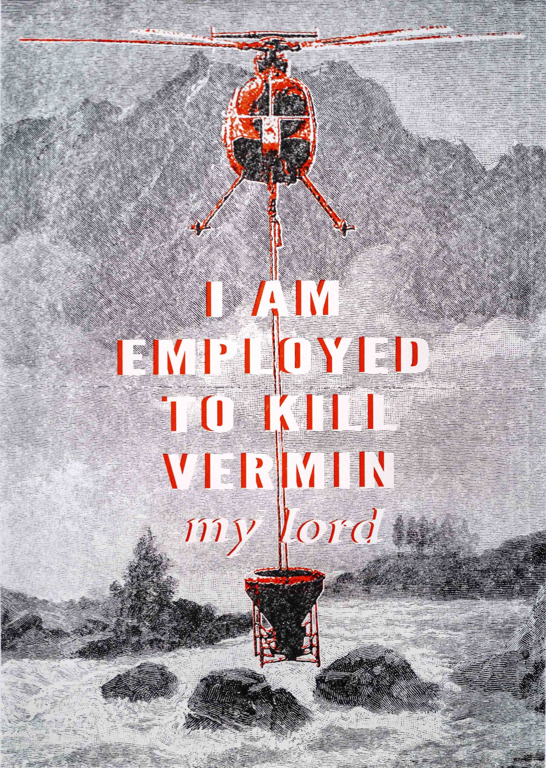 A helicopter carrying a large bucket for dispensing pesticide over the remote regions of NZ, is pictured in front of an etching detail of the alpine region (from the Australasian Pictorial Atlas 1888).